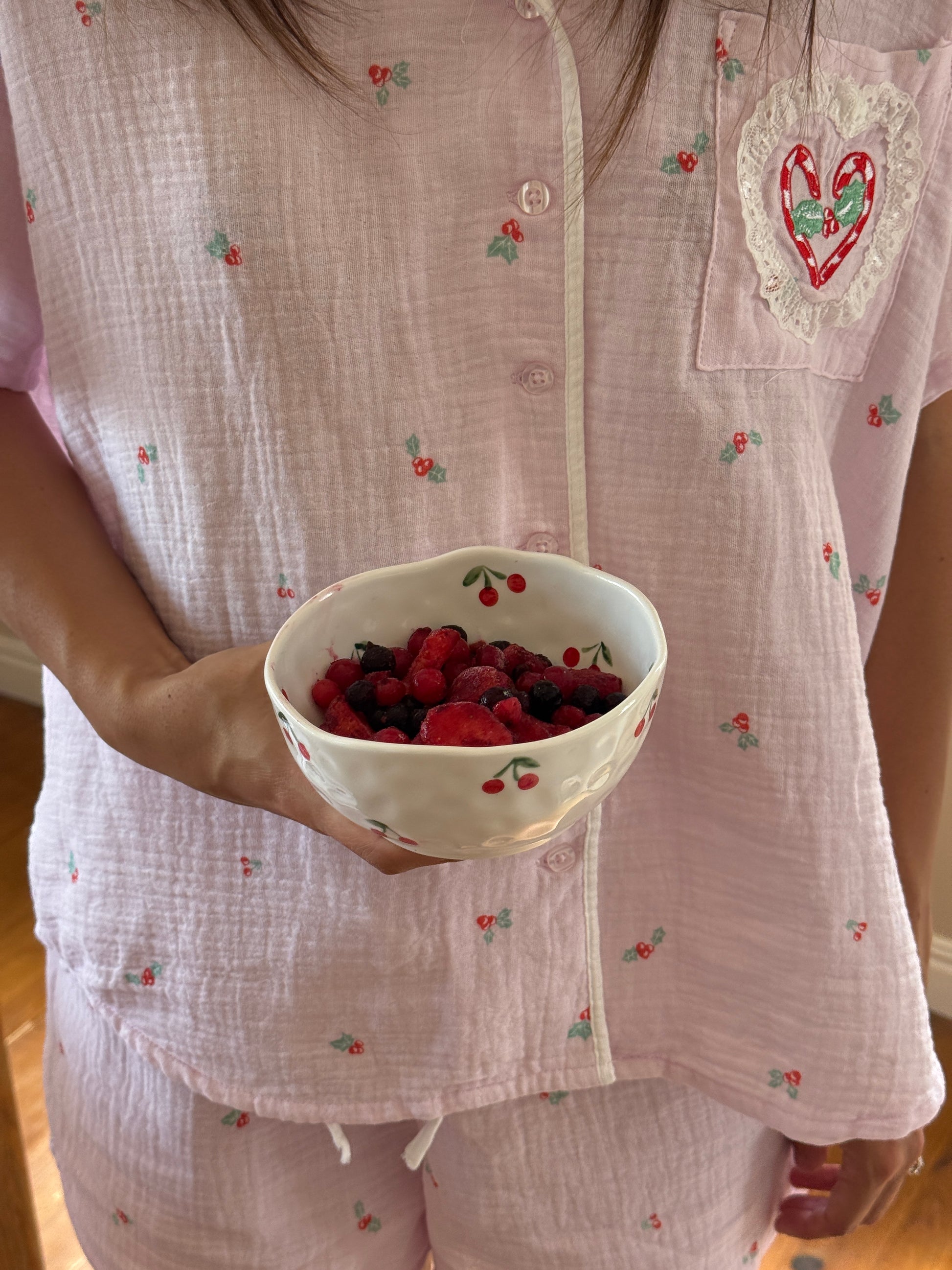 Hand-painted with dainty red cherries and a softly rippled edge, Colette brings a touch of French countryside sweetness to your Christmas table. Perfect for serving festive treats or morning berries, it’s a piece made to be both beautiful and useful, a lovely gift or keepsake for the season