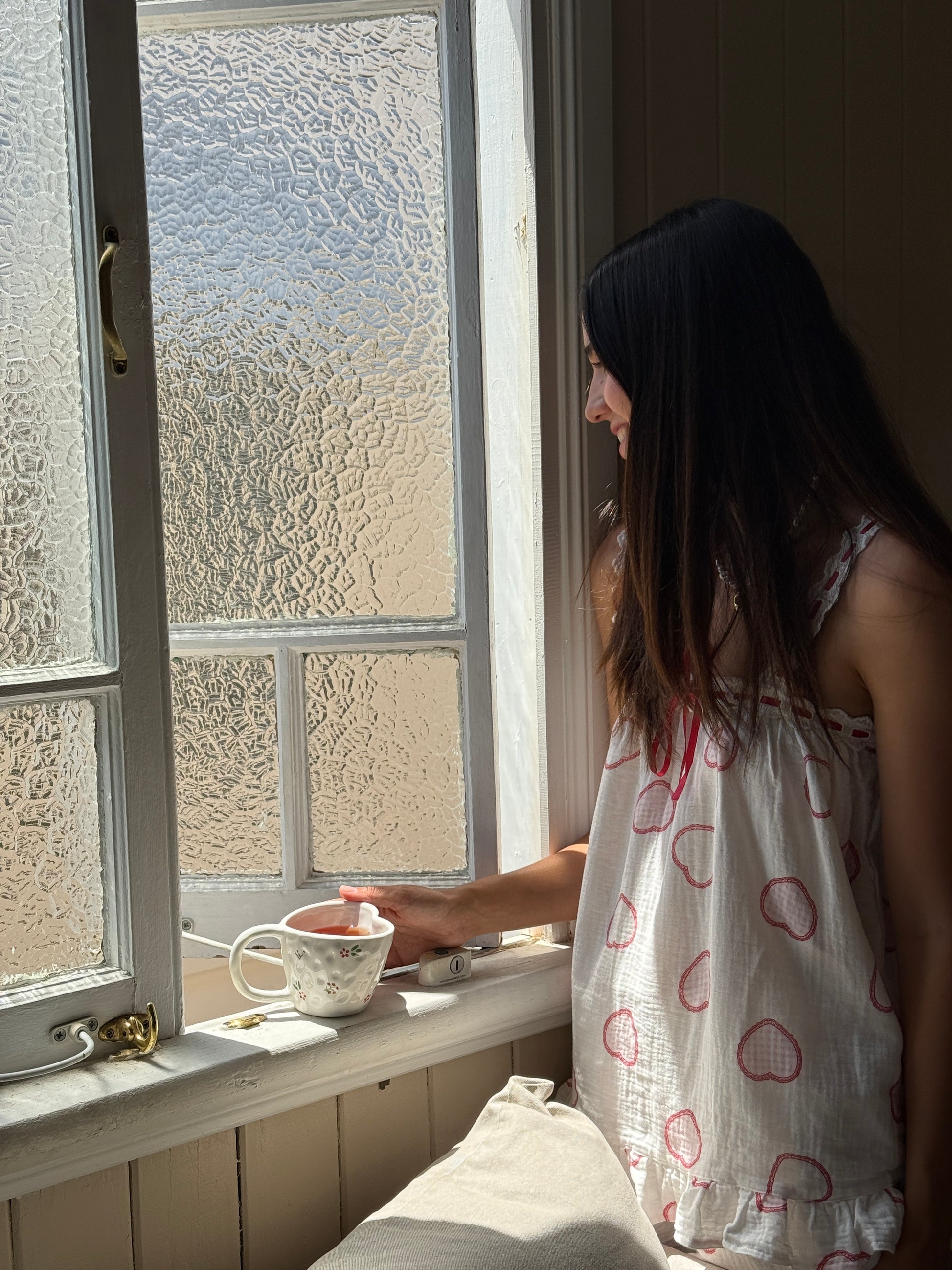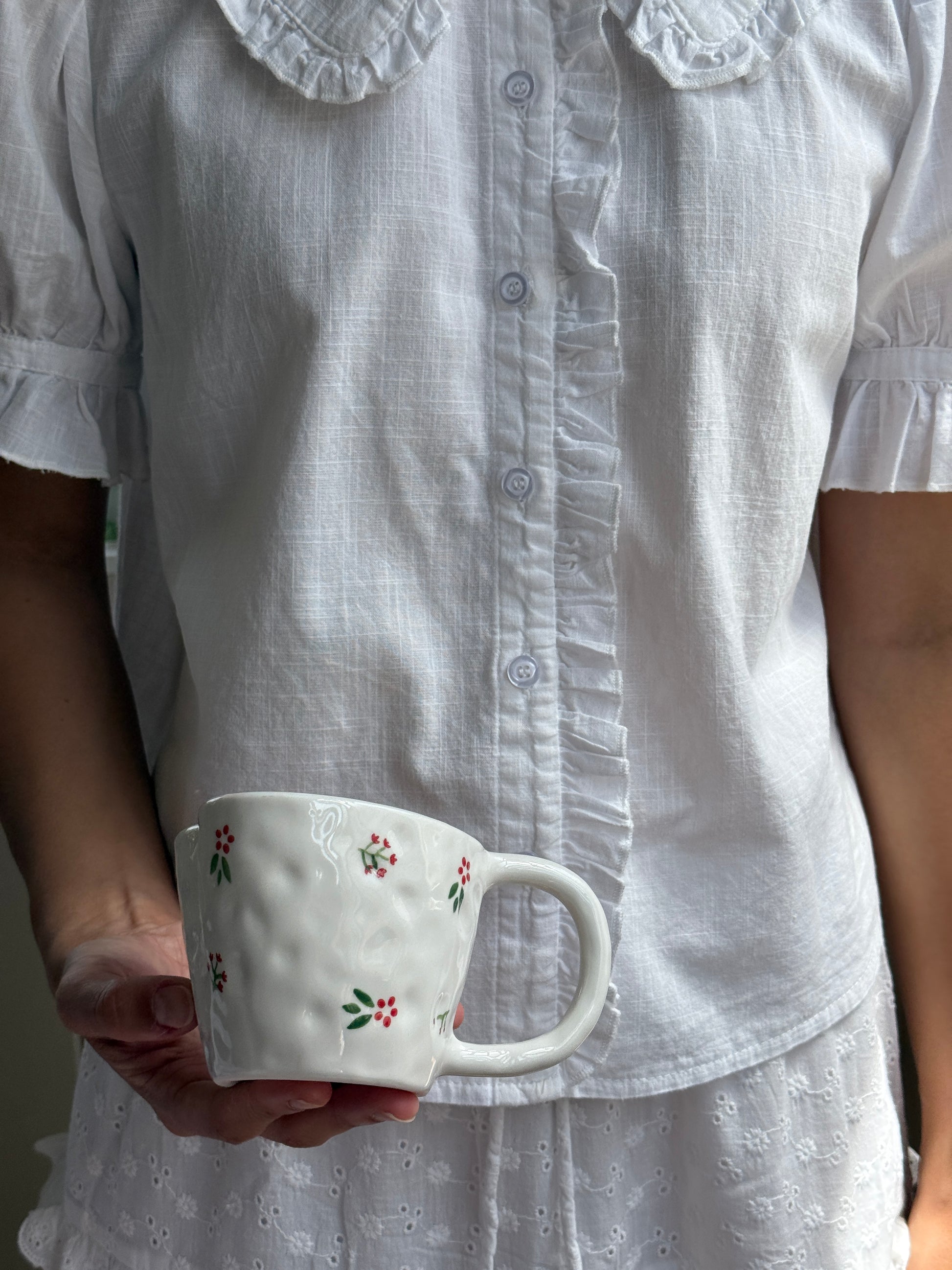 Delicately hand-painted with tiny red florals and green leaves, Florie captures the beauty of a French Christmas garden. Designed for quiet mornings and festive afternoons alike.