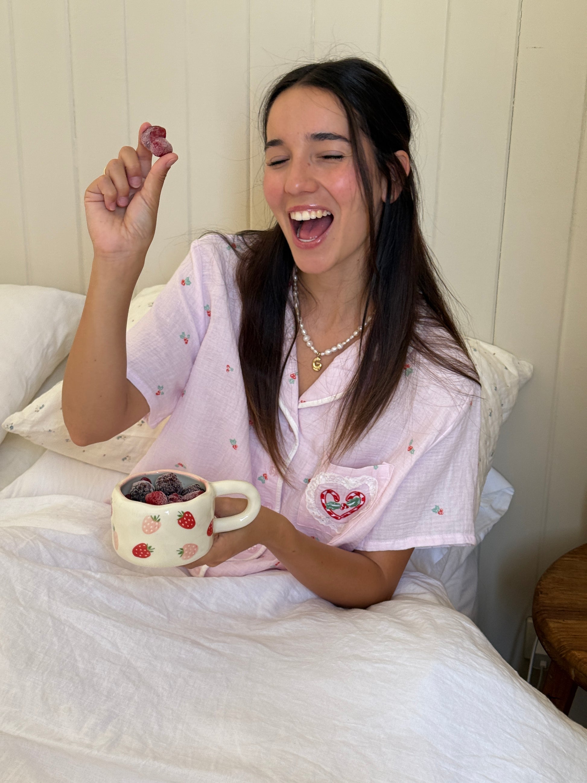 Finished with a soft blush rim, this creamy set feels like Christmas under the summer sun, fresh, playful, and perfectly Gabsies.