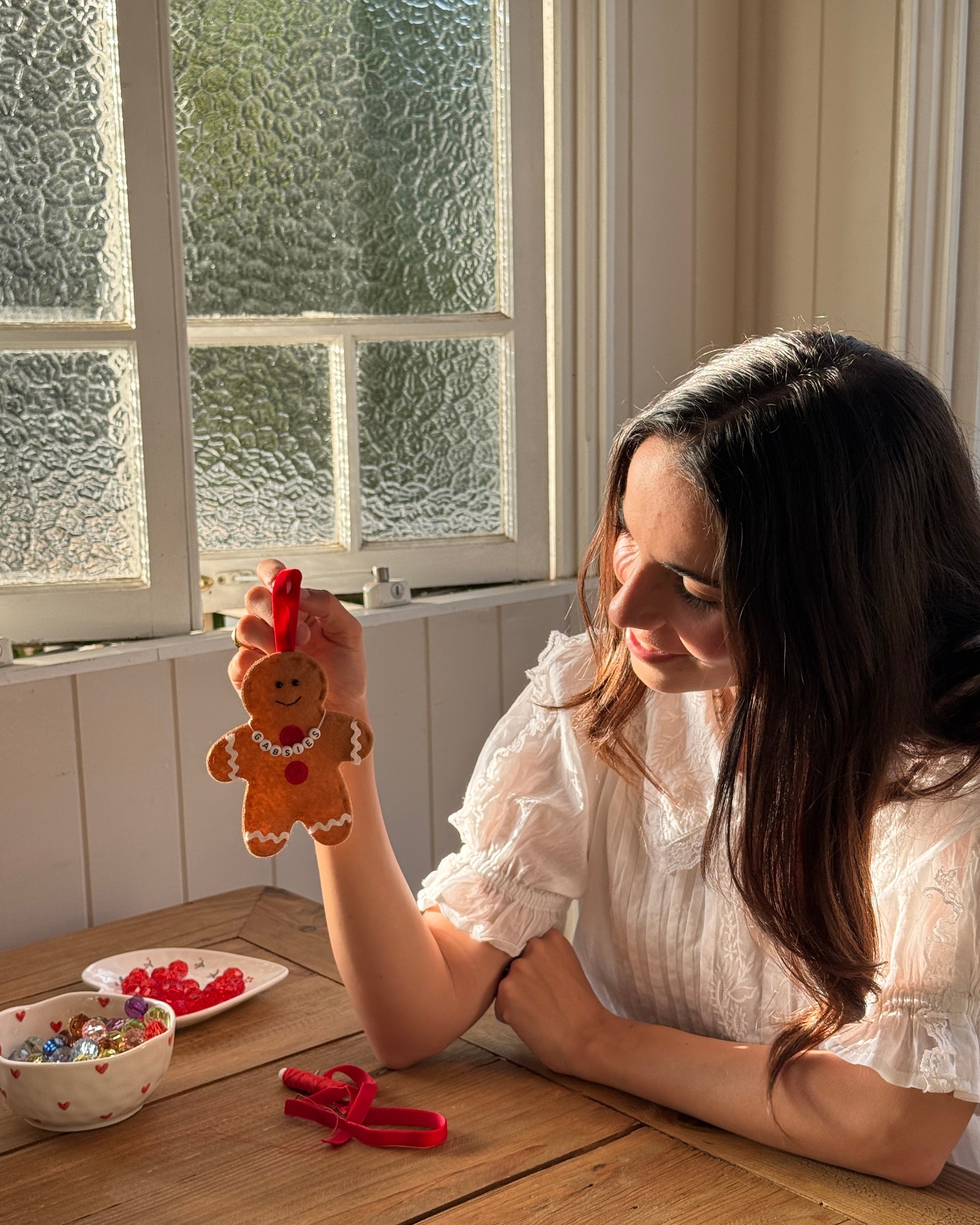 Our Monsieur Biscuit Christmas ornament is full of festive cheer, a soft gingerbread man adorned with a red velvet ribbon and personalised Gabsies beaded necklace. A nostalgic keepsake to treasure each Christmas.