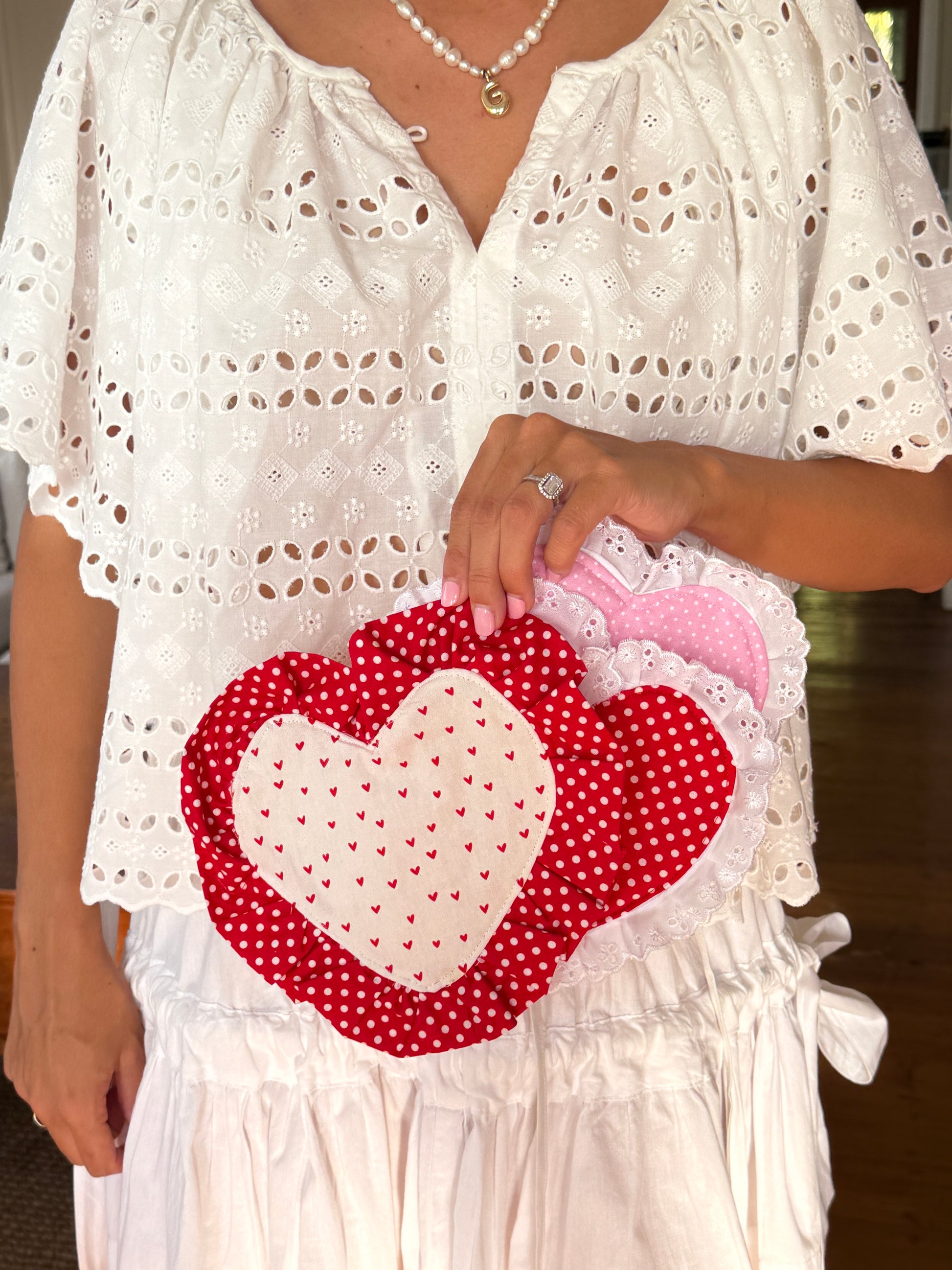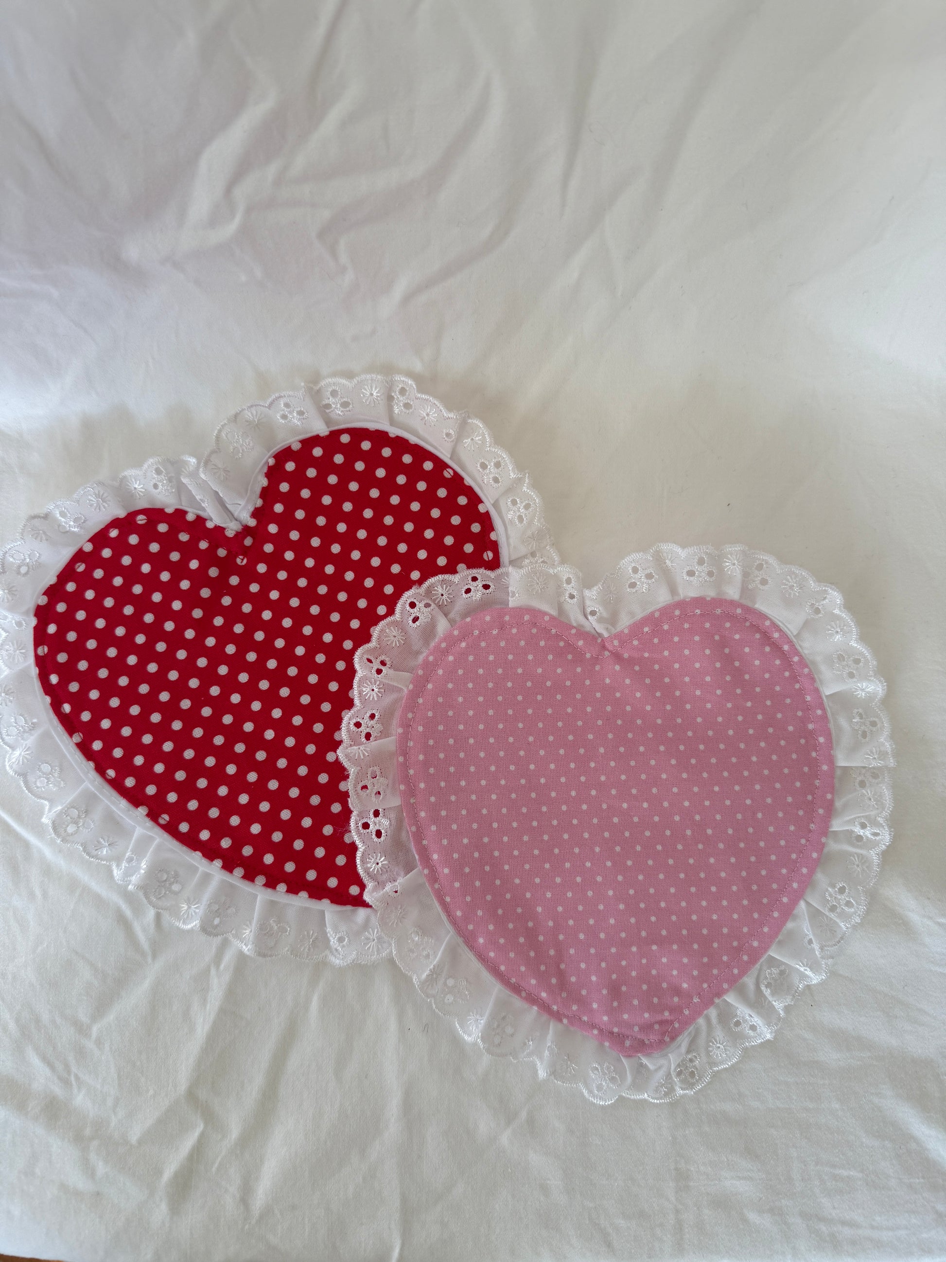 Our heart-shaped coasters are available in red with white spots or hearts, and pink with white spots or hearts. Each piece is handmade, meaning no two are ever exactly the same. You’ll receive your chosen colourway (pink & white or red & white), with slight variations in pattern and trim that make every piece unique.